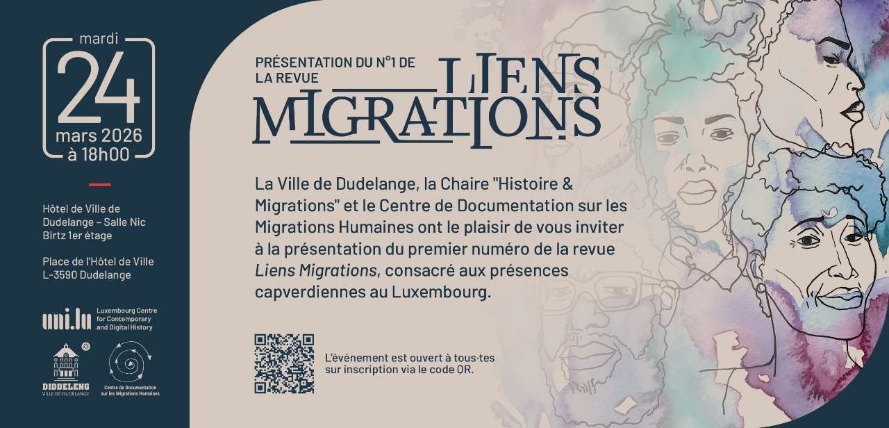Le CDMH a le plaisir de vous inviter au lancement de la lettre d'information de la chaire «Histoire et migrations». Le numéro initial est consacré aux présences capverdiennes au Luxembourg, sujet inspiré par le 50e anniversaire de l'Indépendance du Cap Vert.